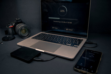 Laptop and smartphone showing file transfer progress with a camera and external hard drive. Backup, storage and data management workflow.