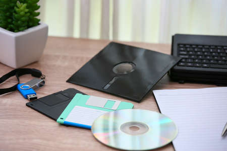 desk with note ,floppy disk A, floppy disk B and memory drive in home office, private office and modern desk in modern life, online market and planning for work, document and paper on desk.