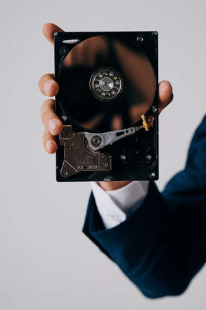Man holds an hard disk. concept of storage and memory.
