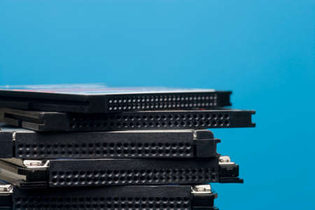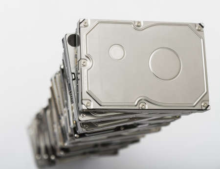 Stack of Hard Disk Drives. Pile of assembled hard drives. Isolated on white. soft focus
