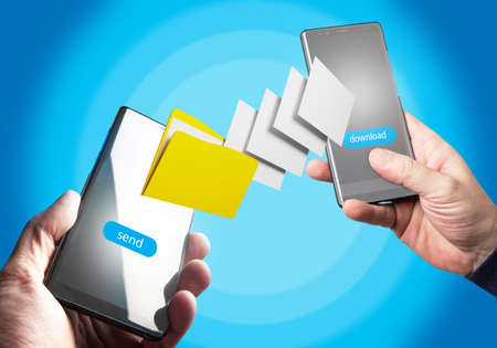 Data exchange applications concept. Hands of people with telephones. Sending and downloading data in smartphone. Mobile phones with data icon. Wireless file transfer applications.