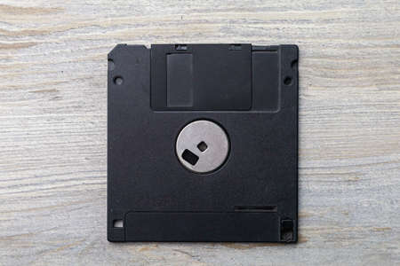 Floppy disk on the table. Nostalgia concept. A rudiment or object that has gone down in history. Background with copy space for text