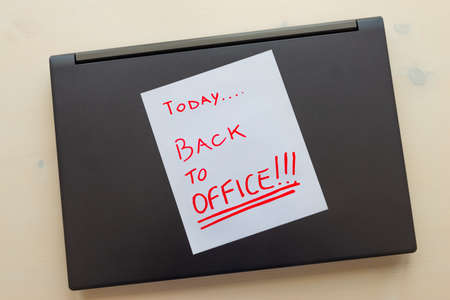 Closed notebook, with white paper with red Today ... back to office written.