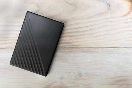 External compact SSD-drive for writing, reading and storing data on wood table background copy space