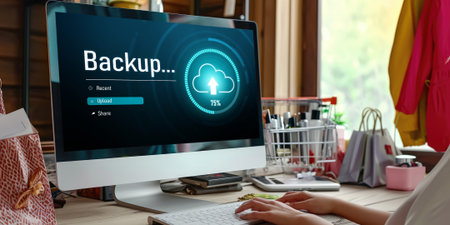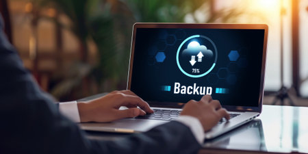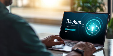 Network Technician Backing Up Servers, Backup in Progress Illuminated on Digital Display.