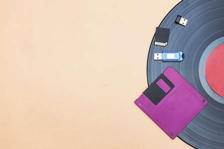 A vintage vinyl record, a floppy disk and modern media are lying next to each other. There is a place for text in the photo