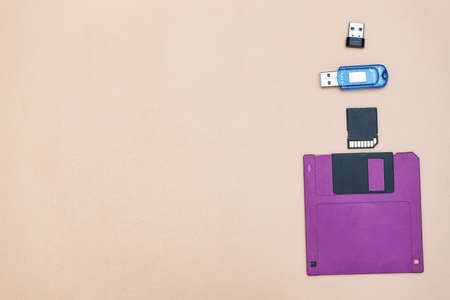 A floppy disk and modern media are lying next to each other. There is a place for text in the photo