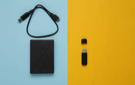 USB flash drive and external hard drive on a yellow blue background. top view