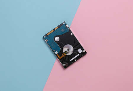 Hard drive on a blue-pink background. top view