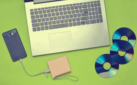 Laptop, smartphone, power bank, CD drives, on a green background. Digital media, gadgets.