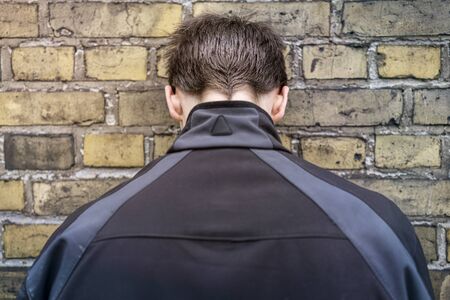 young man standing with his head against the wall