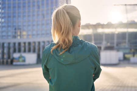 Back view of middle aged woman in sportswear standing outdoors, ready for morning workout