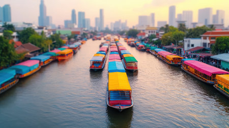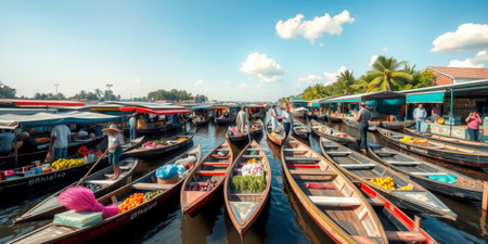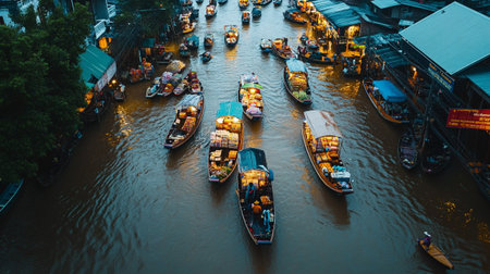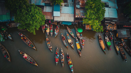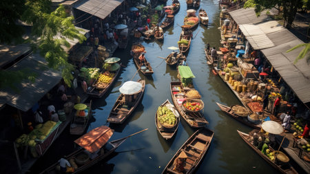 Market Mosaic: Boats & Vendors Form a Colorful Pattern in a Top-Down Thai Market Photo. AI-generated