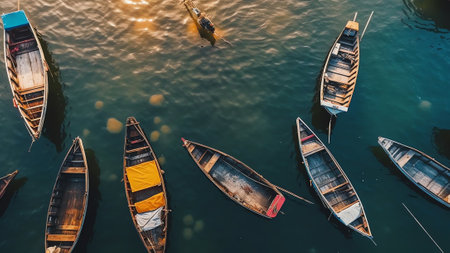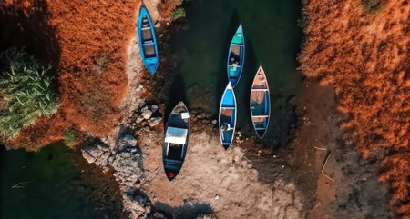 Aerial view of small fishing boats on the river. Top view. AI Gen.