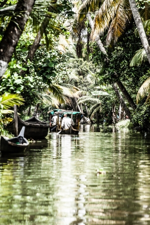 Alleppey - Alappuzha, India - 13 November 2017: Boat tour through the small canals of the Kerala backwaters along small boat drivers and houses,