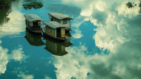 Discover a tranquil scene featuring traditional boats gently floating on calm waters, surrounded by lush greenery and serene nature.