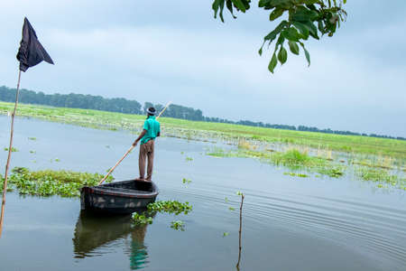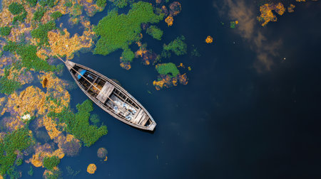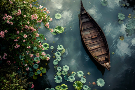 Generative AI illustration of Background fisherman in a boat floating down an Asian river surrounded by water lilies. Asian Rivers