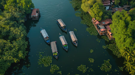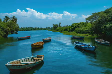 An image captures a serene waterway surrounded by verdant palm trees. Sunlight illuminates the scene, casting reflections on the water. Boats rest on the water, adding to the tranquil atmosphere. This image is suitable for various commercial uses, including travel, nature, or environmental themes.