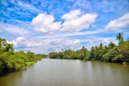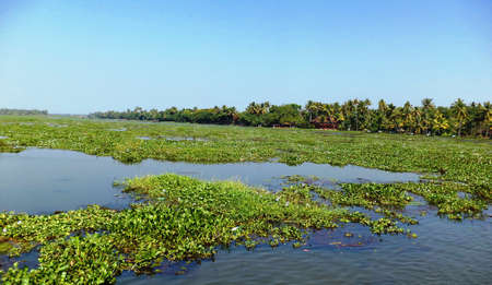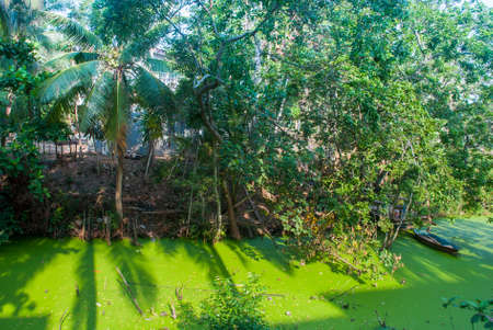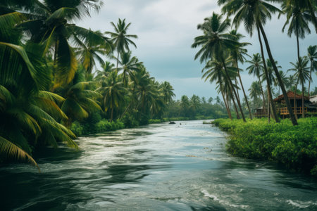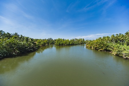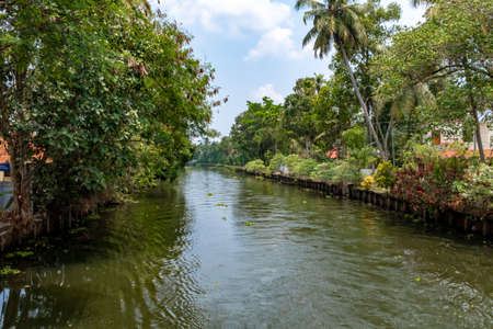 Scenic backwaters in rural Kerala (India) with tropical palm trees, untouched nature and a waterway leading to Kochi and Alleppey