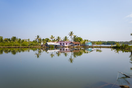 Munroe Island, India - March 4, 2023: Several houses with tiled and metal roofs are situated along the edge of a calm lake, with palm trees and laundry hanging outside, all reflected in the water under a clear blue sky.