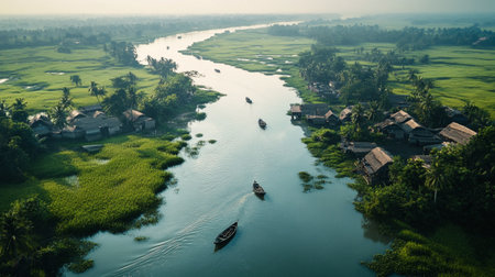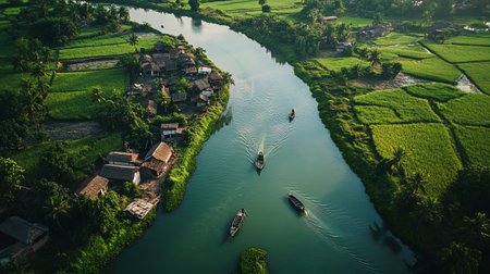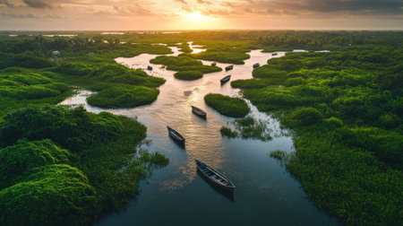 As the sun sets, a peaceful river winds through vibrant green vegetation, with traditional boats resting on the calm waters, showing nature's tranquility.