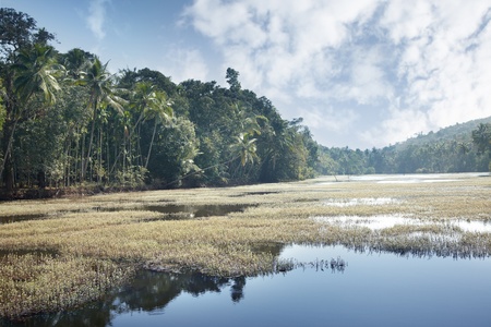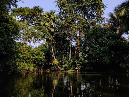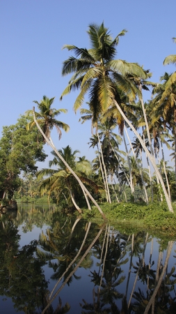 Coconut plantation with reflection on backwater topical landscapes on Poovar Island in India