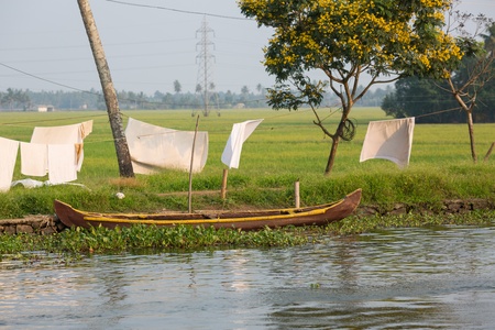 Kerala backwaters, India. Tropical landscape. Channels with ships (fishing boats) and towns under palm trees