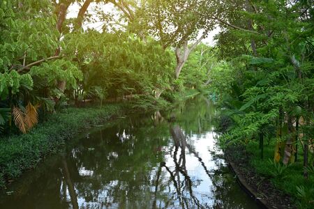 Sunset above the river in jungle with trees along the banks. Forest river sunset scene.