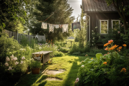a beautiful garden with a clothesline and laundry hanging in the background, created with generative ai