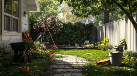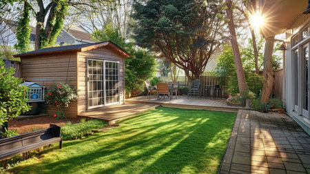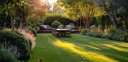 Backyard serenity at sunset. Lush green grass, trees, and flowers fill a peaceful backyard. Wooden picnic table and benches. Sunlight streams through the leaves