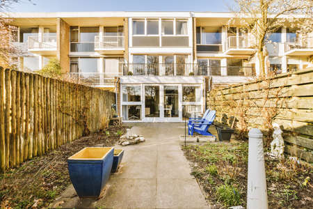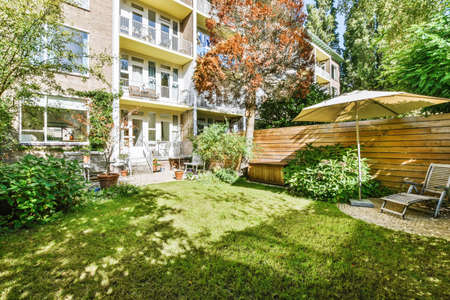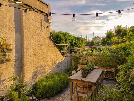 Small walled urban garden full with green plants and wooden furniture in summer during sunrise