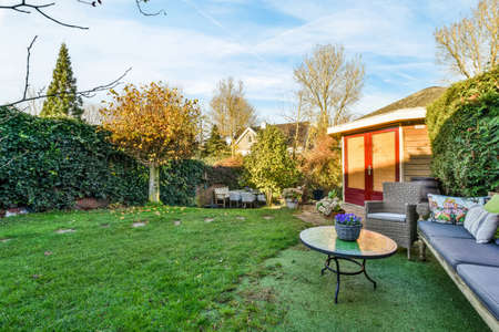 A backyard with a lawn, a small warehouse and a tiled floor at a cozy house