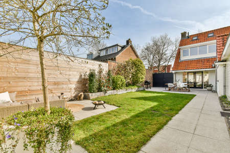 Neat paved patio with sitting area and small garden near wooden fence