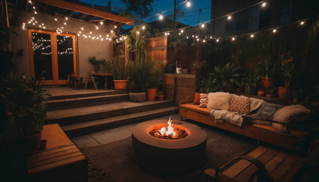 Garden terrace with furniture and lights in the evening at night