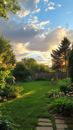 Lush backyard at sunset. Lush green grass, flowering shrubs, trees, and a wooden fence under a beautiful cloudy sky