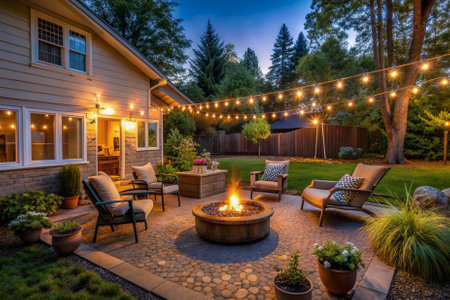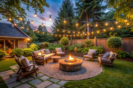 Warm glowing string lights set the mood in a backyard during sunset, with green bokeh background and soft ambiance.