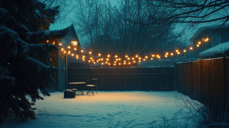 A tranquil snowy backyard illuminated by glowing string lights creates a cozy atmosphere perfect for winter evenings, inviting relaxation and serenity.