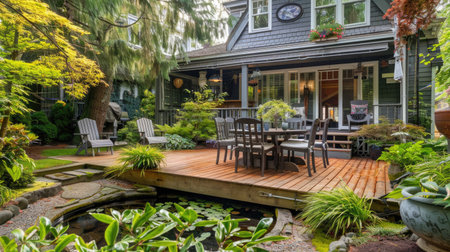 outdoor garden sanctuary, a charming outdoor space featuring a wooden dining set amidst colorful flowers and verdant foliage, ideal for relishing the beauty of nature