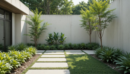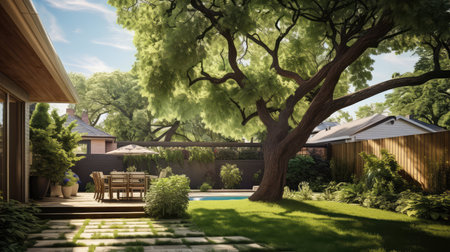 Minimalistic bright and landscaped backyard with dining area for outdoor recreation
