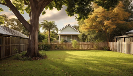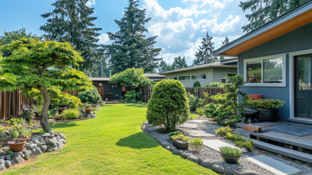 serene backyard with sunlight, modern house, green lawn, trees, tranquility, clear sky, peaceful atmosphere, evening light, nature s beauty, outdoor living space