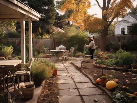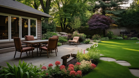 Outdoor dining table and barbeque grill in the back yard of a house. Generative AI illustration