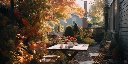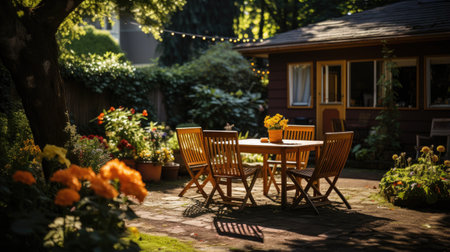 Backyard garden terrace wooden table and chair full of flowers and green with warm light.