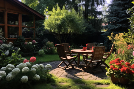 an outdoor patio surrounded by lush foliage and colorful blooms, created with generative ai