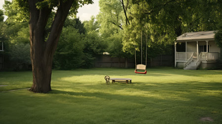 A cozy backyard with a green lawn, a rocking chair and a garland strung between the trees. Recreation area on a country site.