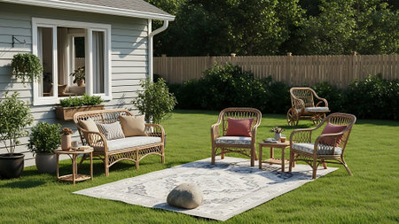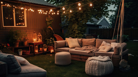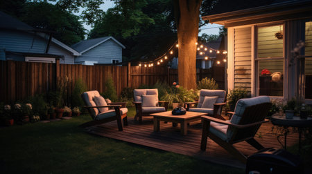 Suburban Serenity: Summer Evening Patio with Garden Lights and Wicker Decor. Generative ai. High quality illustration