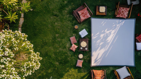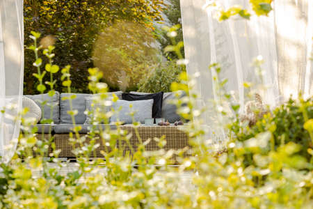 outdoor lounge area, with plush cushions and throw pillows, surrounded by greenery, created with generative ai