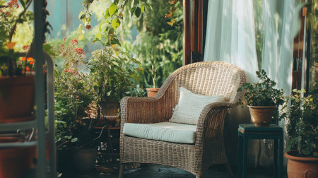 This image showcases a cozy wicker chair in a vibrant indoor garden, filled with lush greenery and warm natural light, creating a serene and inviting atmosphere.
