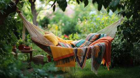 A cozy hammock draped with colorful blankets and pillows, set up in a lush garden for a relaxing afternoon