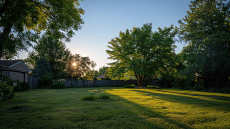 serene backyard with sunlight, modern house, green lawn, trees, tranquility, clear sky, peaceful atmosphere, evening light, nature s beauty, outdoor living space