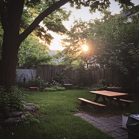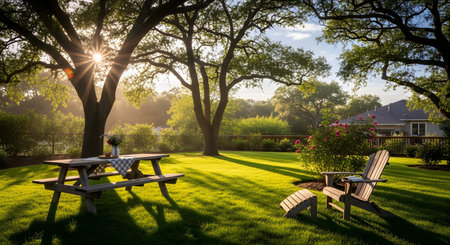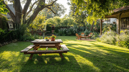 Backyard serenity at sunset. Lush green grass, trees, and flowers fill a peaceful backyard. Wooden picnic table and benches. Sunlight streams through the leaves